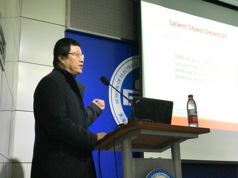 报告会开始,韩军功博士应邀对华威大学的博士招生情况进行了简单介绍,为在场同学分享研究经验。其后,韩军功博士针对图像显著性物体检测这一科学研究课题做详细报告。报告中,韩军功博士首先介绍了图像显著性物体检测的研究意义、发展历程、以及发展趋势,对当下显著性物体检测存在的科学问题进行剖析。随后,韩军功博士分享了其在该领域完成的先进工作,具体包括:一种基于多层级上下文信息引导的显著性物体检测技术,解决当下显著性检测中存在的物体特征不鲁棒问题;一种基于胶囊神经网络的显著性物体检测方法,探究显著性物体的部件关系,保证对显著性物体检测的完整性。报告结束后,韩军功博士详尽回答了在场师生的疑问,与在场师生进行深入广泛的交流讨论。