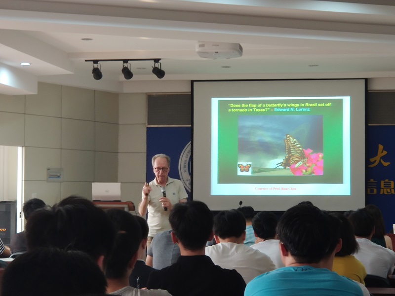 高忠科教授首先对Celso Grebogi院士的来访表示欢迎,随后 Celso Grebogi院士围绕其近期科研工作展开报告,介绍了耗散系统混沌动力学领域的一些基本概念和性质。举例论述其应用于气象研究、物种灭绝研究,甚至对心脏及大脑混沌现象的控制。并就混沌系统的初值敏感性对短、长期预测的影响等问题展开讨论。高忠科教授全程配合中文解说,通俗易懂。会后,Celso Grebogi院士同与会师生就复杂网络与非线性动力学系统等问题进行了深入的交流和讨论。