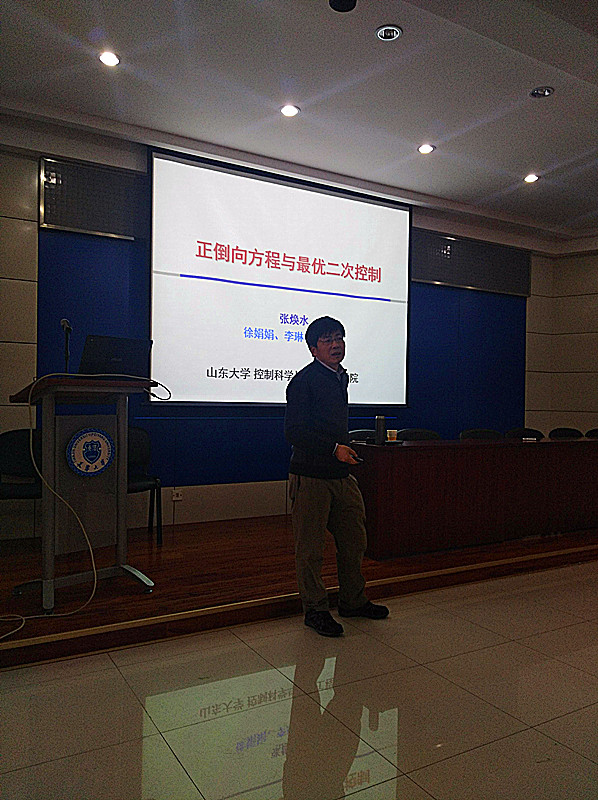 张国山教授主持报告会,60余名师生听取了报告,并与张焕水教授就正倒向方程的解以及最优二次控制的相关研究进行了深入的交流。