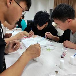 数字油画是在标有号码的填色区内填上相应标有号码的颜料,用细心和耐心填色绘制漂亮的手绘作品。活动中,学生党员齐心协力,共同参与其中,在创作中,再次回顾党的百年发展史,让历史化作线条色彩流淌在笔端,几小时过去,画布上的线条图案由黑白变得多彩生动。用画笔让历史活起来,将党的光辉历程、青年学子对中华民族伟大复兴的中国梦的期许,生动地呈现在画布之上。