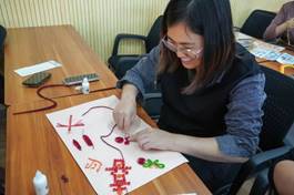 衍纸艺术是用工具将细长的纸条一圈圈卷起来,成为一个个小"零件",然后组合这些样式复杂、形状各有不同的"零件"来创作。活用纸张的特质,呈现出来的成品从原有的平面扩及至立体世界,衍纸工艺既有绘画的色彩表达能力,又有雕塑的空间视觉效果。活动伊始,大家一起学习衍纸的工艺流程和制作技法,通过一个个小纸圈变化着不同的形状,各种形式的自由组合,再融入独具匠心的创意思维,“卷、捏、拼、贴”,手指翻动间便有着一幅幅生动的衍纸作品呈现出来。
