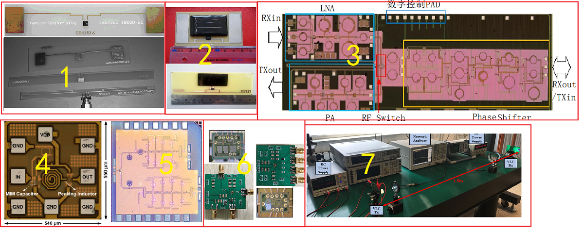 6、可见光通信专用芯片,指标:可见光LED调制驱动芯片,可实现数据传输速率622Mbps; 可见光电集成接收机芯片,速率622Mbps。可见光通信系统:速率≥622Mbps,误码率≤10-3。芯片与模块见图6,可见光通信系统测试见图7。