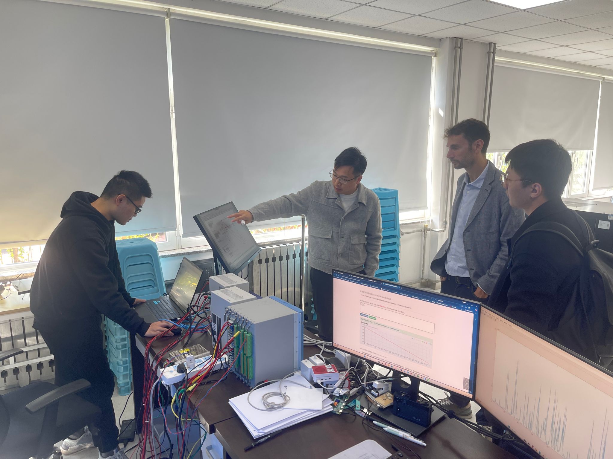After the presentation, Professor Oriol and his delegation visited the laboratory’s Hardware-in-the-Loop (HIL) experimental testing system for AC/DC grid protection and control, independently developed by Tianjin University. This system can accurately simulate various typical operating scenarios and fault characteristics of new power systems, providing a comprehensive verification platform for testing protection and control devices. Team members demonstrated two self-developed devices on-site — a DC line transient directional pilot protection device and a fast time-domain distance protection device for renewable energy grid-connected lines. Professor Oriol highly praised the team’s innovative achievements in “rapid fault identification–secure fault ride-through–reliable recovery” for DC systems, remarking: “The Tianjin University team’s innovations in flexible DC protection and fault ride-through are world-class. Their systematic achievements from theoretical research to product development and engineering application are truly admirable.”