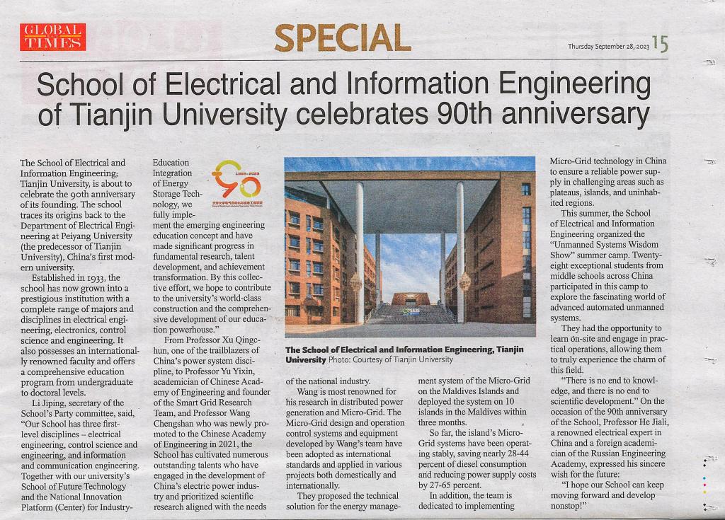 Global Times: School of Electrical and Information Engineering of Tianjin University celebrates 90th anniversary